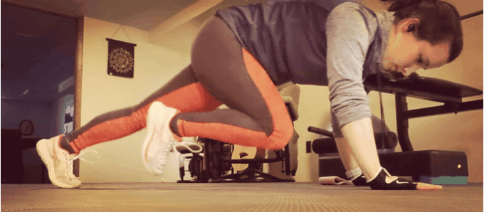 - Start in a traditional plank — shoulders over hands and weight on just your toes. With your core engaged, bring your right knee forward under your chest, with the toes just off the ground. Return to your basic plank. Switch legs, bringing the left knee forward.