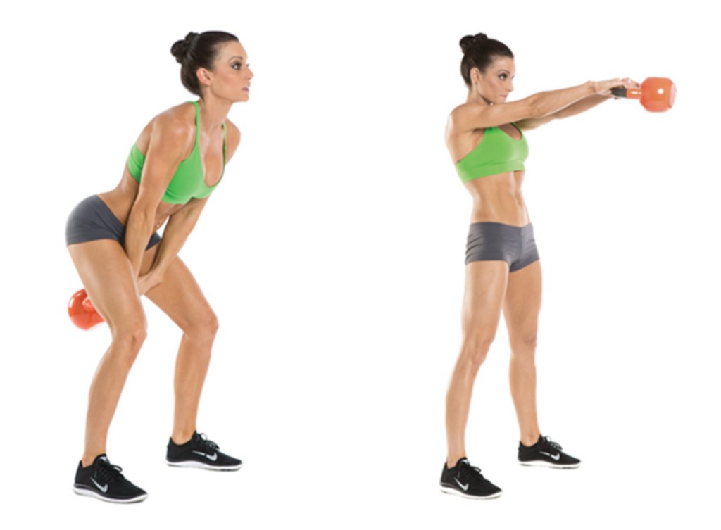 - Swing it: Keeping the arch in your lower back, bend your hips back until the kettlebell is between and behind your legs; squeeze your glutes to extend your hips and swing the weight up.